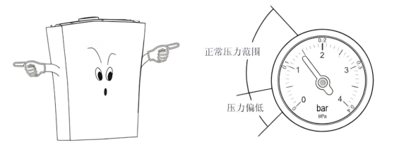 當(dāng)水壓低于1bar時(shí),壁掛爐將出現(xiàn)水泵不轉(zhuǎn)或空轉(zhuǎn)的現(xiàn)象,壁掛爐會啟動(dòng)停機(jī)保護(hù)機(jī)制,以避免在缺水或者無水狀態(tài)下燃燒,出現(xiàn)干燒。