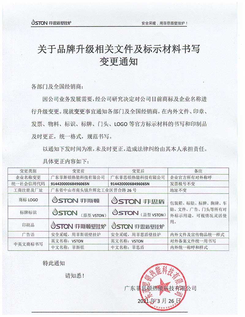 因公司業(yè)務發(fā)展需要,經公司研究決定對公司目前商標及企業(yè)名稱進行升級變更。現(xiàn)就變革事宜通知各部門及全國經銷商,在內外文件、印章、發(fā)票、物料、標識、標牌、門頭、LOGO等官方標示材料的書寫和印制品及時更正,統(tǒng)一格式,規(guī)范書寫。
