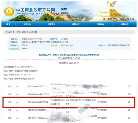 臨漳縣2020年“煤改氣”項目燃氣壁掛爐采購與安裝企業(yè)入圍中標(biāo)公告
