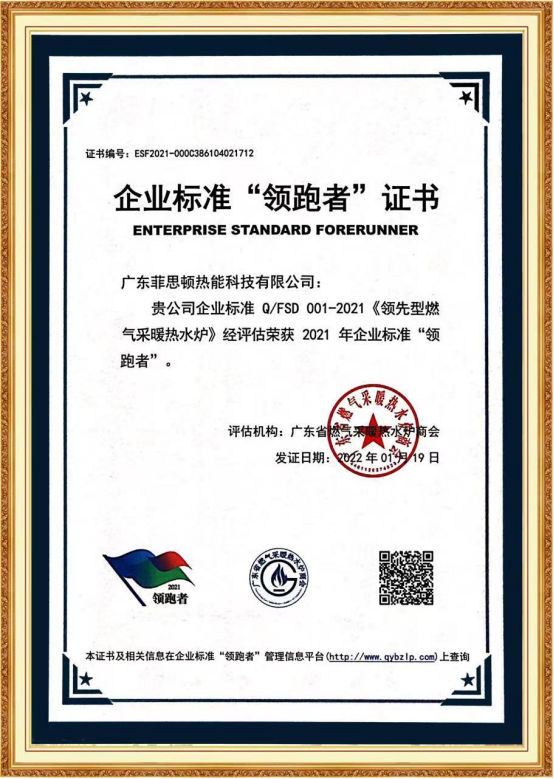 菲思盾獲評《2021燃氣采暖熱水爐企業(yè)標準“領跑者”》榮譽稱號