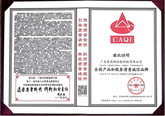 廣東菲思頓熱能科技有限公司作為質(zhì)量誠信倡議企業(yè),憑借自身過硬的產(chǎn)品質(zhì)量、貼心的售后服務(wù)、不斷創(chuàng)新的行業(yè)技術(shù),通過嚴(yán)格評選與考核,最終榮獲多個(gè)產(chǎn)品質(zhì)量誠信經(jīng)營認(rèn)可稱號。為全面提高產(chǎn)品和服務(wù)質(zhì)量,提升國家質(zhì)量競爭力,營造推動質(zhì)量強(qiáng)國建設(shè)的良好社會氛圍作出表率作用。
