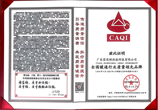 近日,在由中國質(zhì)量檢驗(yàn)協(xié)會舉辦的2022年全國“質(zhì)量月”質(zhì)量誠信倡議專題活動中,廣東菲思頓熱能科技有限公司榮獲“全國產(chǎn)品和服務(wù)質(zhì)量誠信品牌”、“全國質(zhì)量檢驗(yàn)穩(wěn)定合格產(chǎn)品”、“全國暖通行業(yè)質(zhì)量領(lǐng)先品牌”等榮譽(yù)稱號。