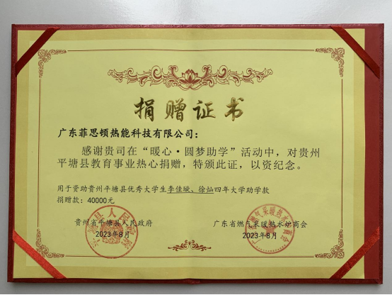 為幫助更多的困難家庭品學兼優(yōu)學生實現(xiàn)求學夢。8月初,廣東菲思頓熱能科技有限公司攜手貴州省平塘縣人民政府開展捐資助學活動,為2名困難大學生送上40000元助學金,解決他們四年學費難題,幫助她們圓夢大學。