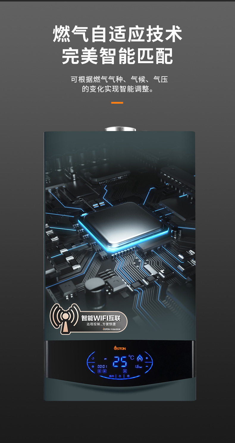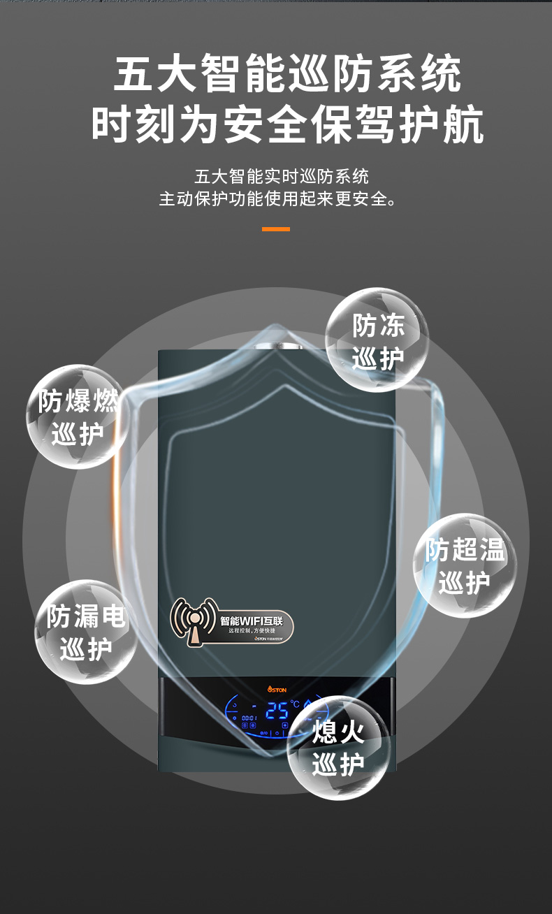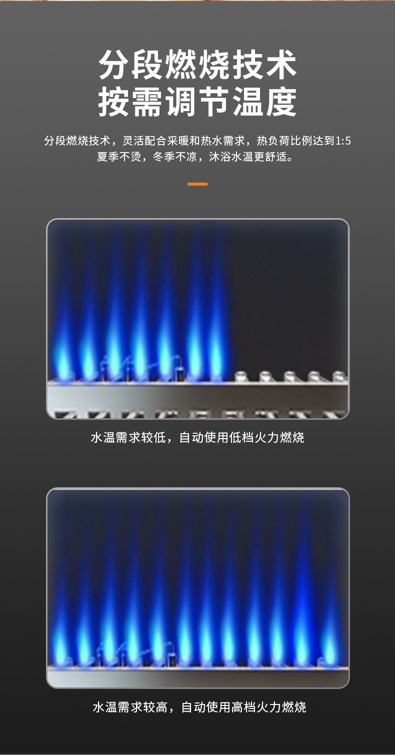 分段式燃燒,熱負(fù)荷調(diào)節(jié)比1:5,徹底解決夏季水溫過高燙傷安全問題。