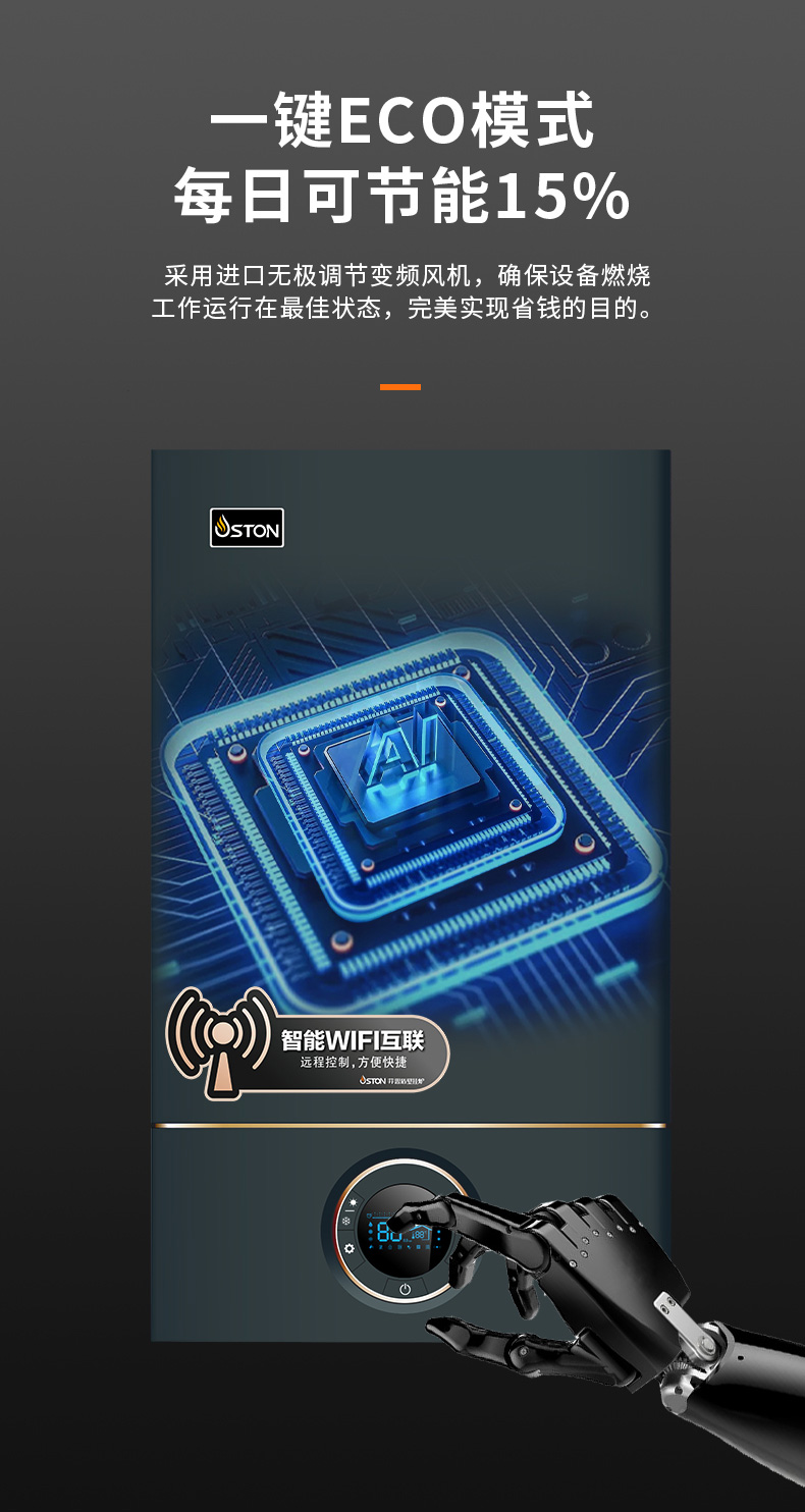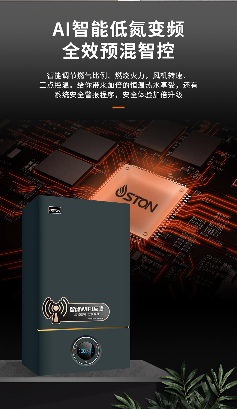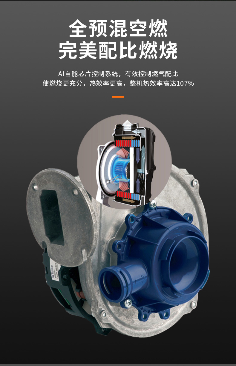 AI智能芯片集成變頻控制燃?xì)忸A(yù)混系統(tǒng)、燃燒系統(tǒng)、冷凝系統(tǒng)、燃?xì)馀浔?,使燃燒更充分?/font>