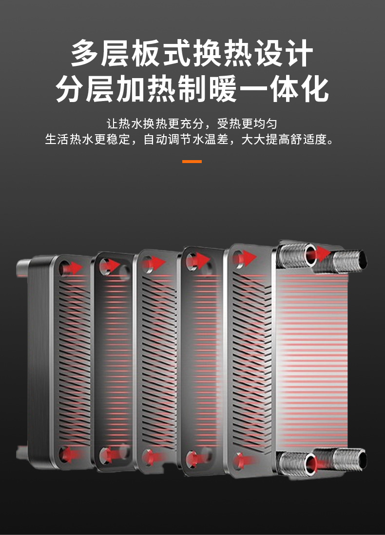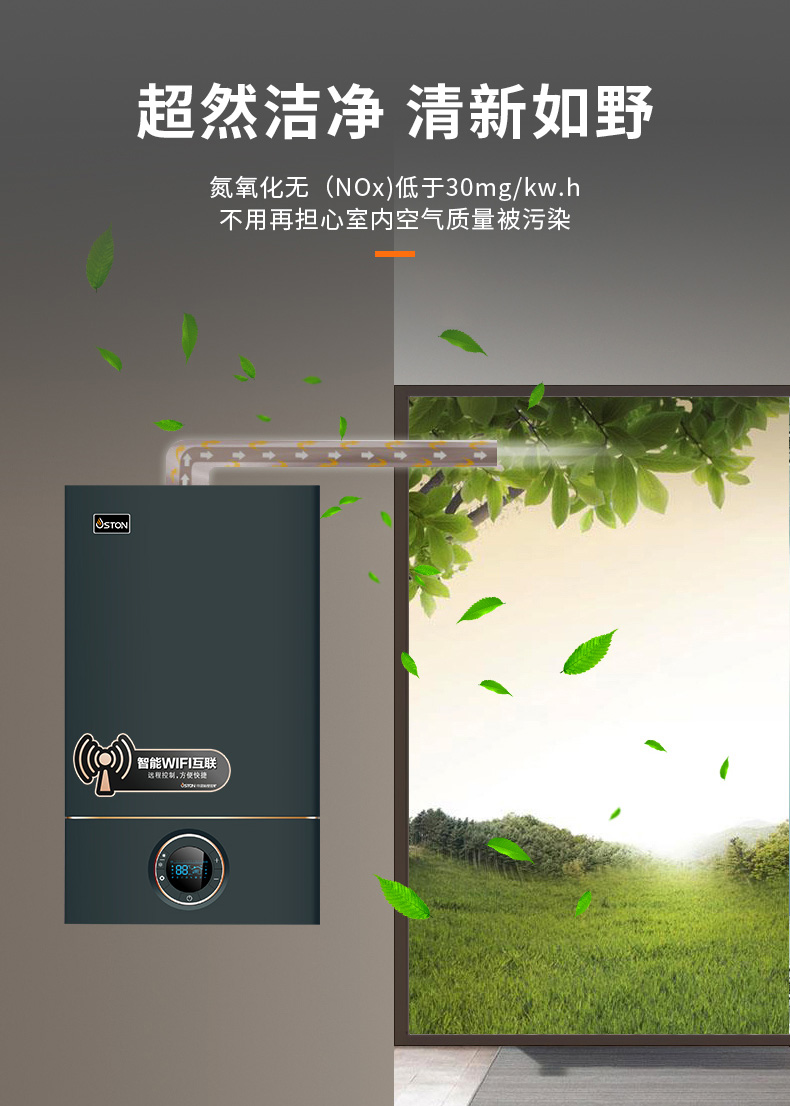 全預(yù)混空燃完美配比燃燒、一級(jí)能效、整機(jī)熱效率達(dá)107%