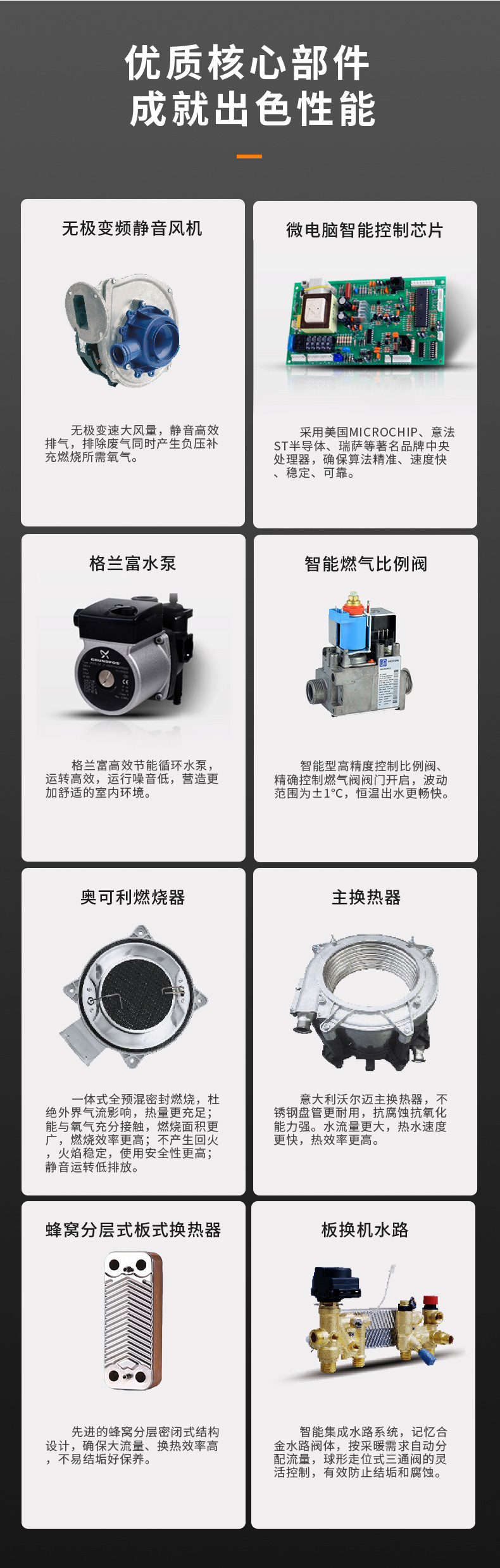 熱效率更高,意大利原裝進(jìn)口Orkli陶瓷纖維燃燒器、西特高精度比例閥、SITEVDC變頻風(fēng)機(jī),